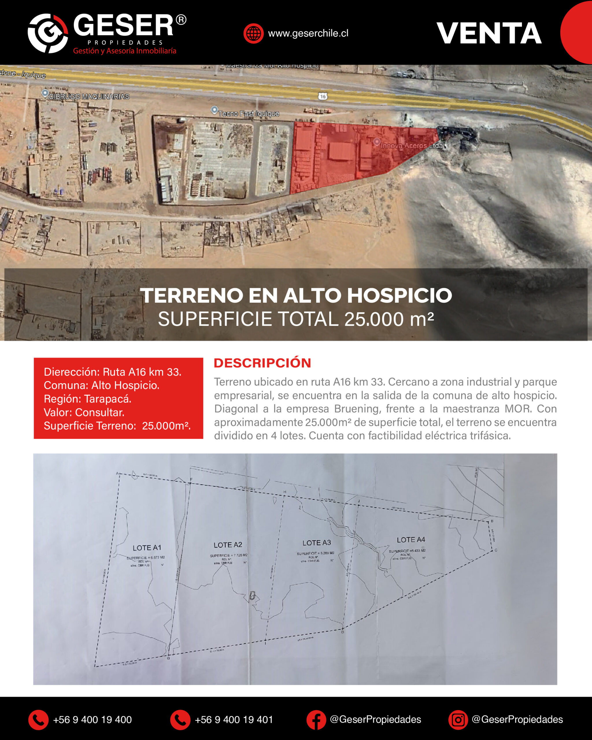 Ubicado en Ruta A-16, Km 33, Comuna Alto Hospicio, Región de Tarapacá